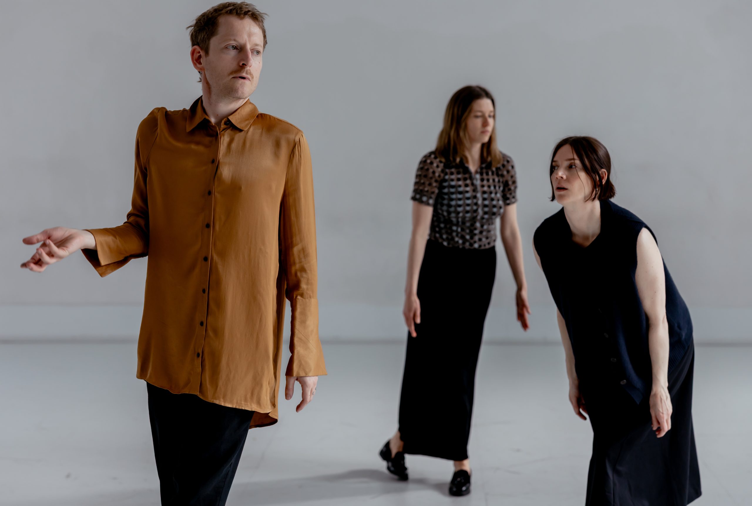De tre erfarne danserne har arbeidet sammen i flere verk av Bjørnsgaard, og har utviklet en felles refleksjon som gjør det mulig å gå dypere inn i den bevegelsesmessige utforskningen av det flertydige og det utsatte relatert til en visuell dramaturgi.